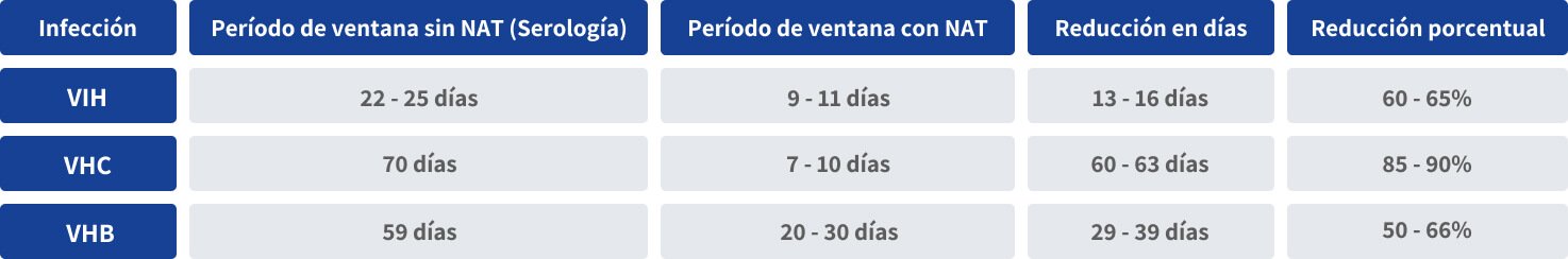 Gracias a esta capacidad de reducir significativamente el período de ventana, las pruebas NAT contribuyen de forma decisiva a fortalecer la seguridad transfusional, permitiendo componentes sanguíneos más seguros y confiables para los pacientes y la comunidad.